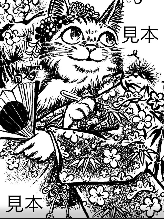 「御ニャン印」とは? 川崎文具店の新キャラクター”ミャーコさん”登場を記念して、御朱印ならぬ「御ニャン印」を販売します。 月ごとに販売される絵柄が変わるので、毎月お楽しみいただけます。 イラストは、岐阜新文化会のイラストレーターのみなさんにご協力いただきました。 〇1月は【西嶋かずち先生】です! 御ニャン印下部に、注文日の日付を記入して送付いたします。 御ニャン印のイラストは注文日を基準に致しますので、月の末日にご注文される方はご注意ください。