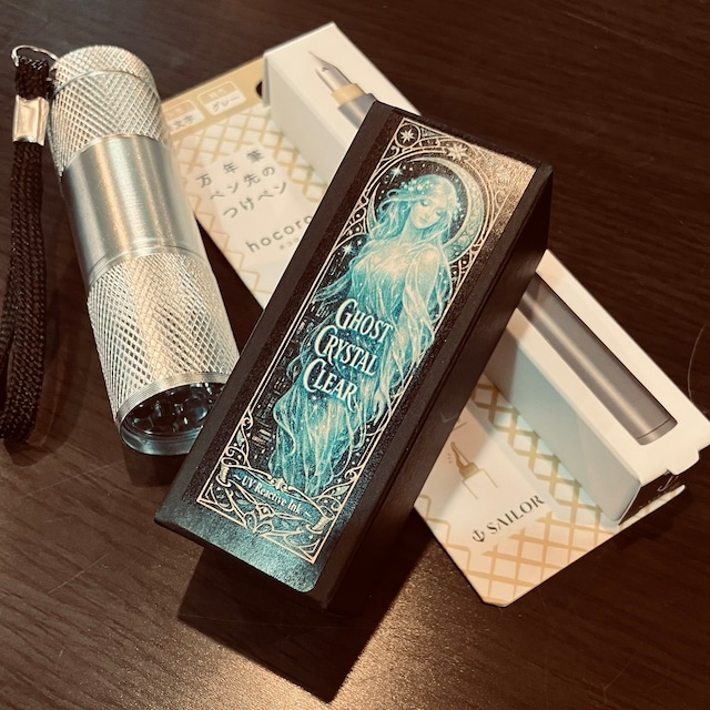 【スターターキット】Ghost Crystal Clear(ゴースト クリスタルクリア) 届いたらすぐ使えるスターターキットのご紹介です。(ブラックライトに使用する電池は別売りです。) 間の中でだけ、姿を現すインク。 可視光では無色透明。 ゴースト クリスタルクリアは、ブラックライトを当てると、青白く静かに発光します。 書斎を漂う幽霊のように、ひそやかで、美しい筆跡。 内容: ◯ゴースト クリスタルクリア 10g ◯ブラックライト ※電池は別売りです。 ◯つけペン <製品について> ◯本製品「ゴースト クリスタルクリア」は、ブラックライト(UV)照射下で発光する無色透明の特殊インクです。 ◯ガラスペン・つけペン等のディップペンでの使用を推奨します。 ◯万年筆への使用は、ペンの構造や状態により目詰まり等の可能性があるため、お客様ご自身の判断と責任にてお願いいたします。 <注意> ・飲まないでください。 ・誤飲時は、直ちに医師へ。 ・目に入った場合は水で洗浄。 ・小児の手の届かない所へ保管。 ・高温・直射日光・火気厳禁。 ◯本製品の使用によるいかなる損害についても、当社は責任を負いかねます。 <配送方法について> クロネコゆうパケットまたはネコポスをご選択頂いた場合、配送方法の都合上、外箱と内容物を別にした状態で梱包させていただきます。ご了承下さい。