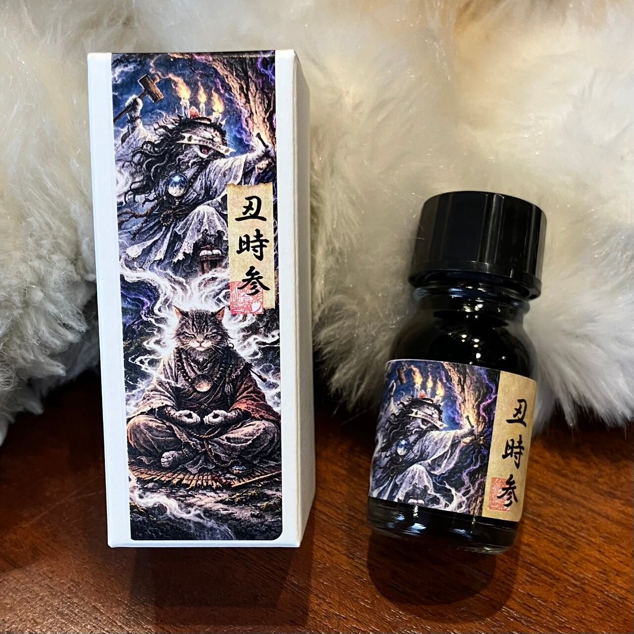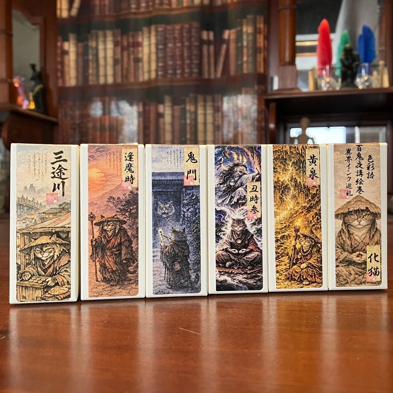 (「三途川」は水性染料インク、「逢魔時」「丑時参」「黄泉」「鬼門」「化猫」は古典インクです。)