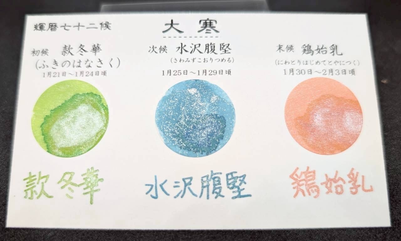 約5日で変化する四季の移ろい七十二候をインク(ラメ入り)で表現しました。